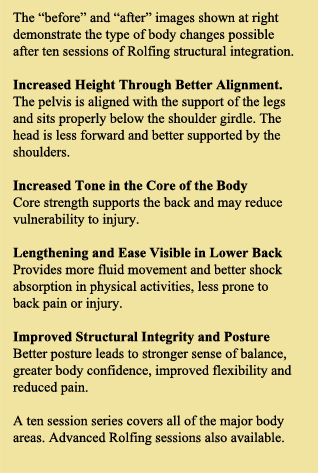 Rolfing Structural Integration is a system of bodywork and movement education that reorganizes the entire body in gravity. By manipulating the